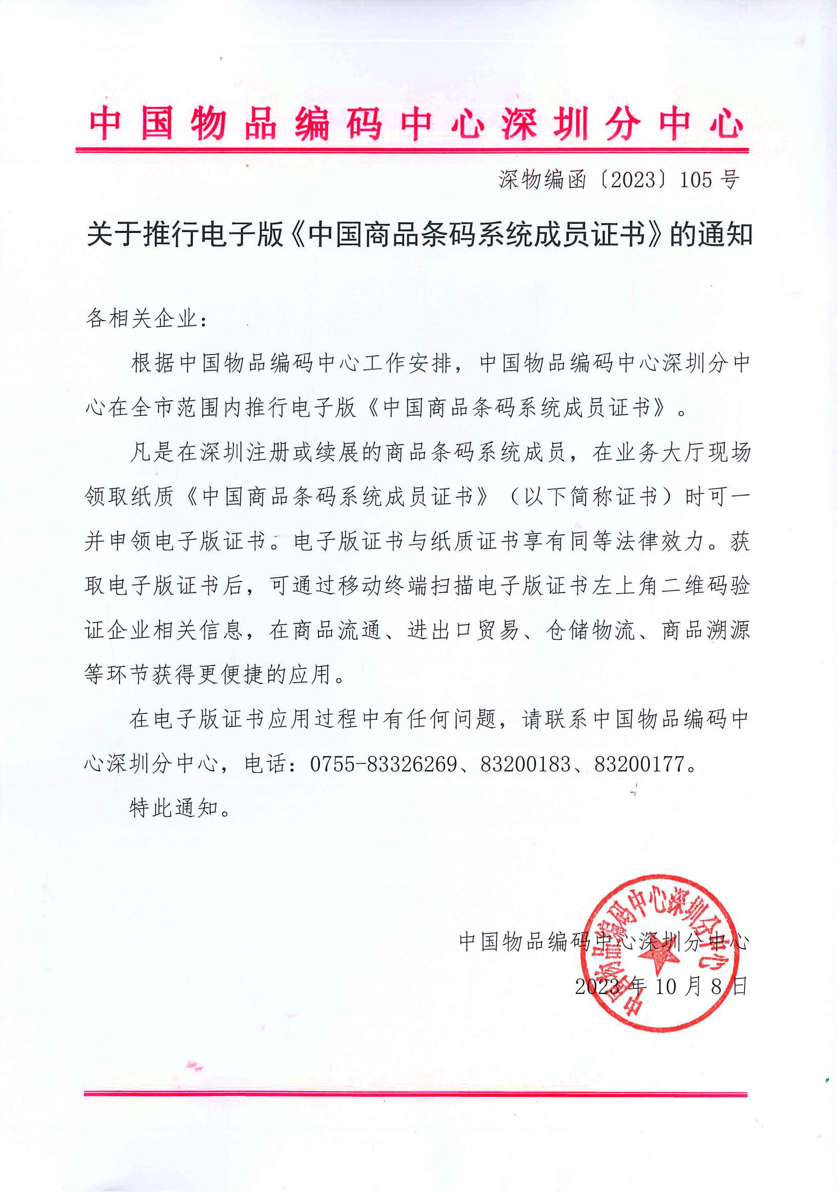 关于推行电子版《中国商品条码系统成员证书》的通知(深物编函〔2023〕105号)