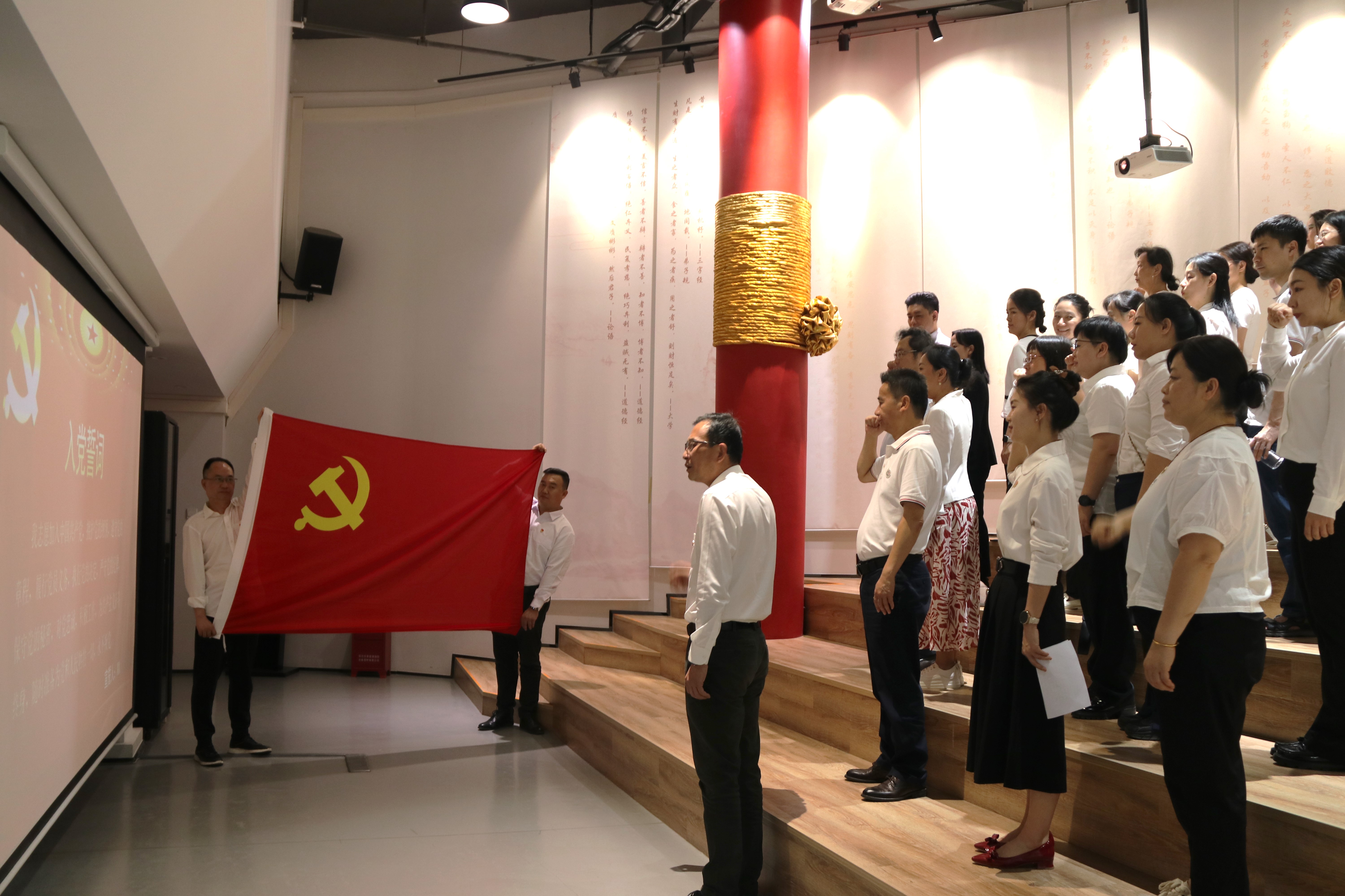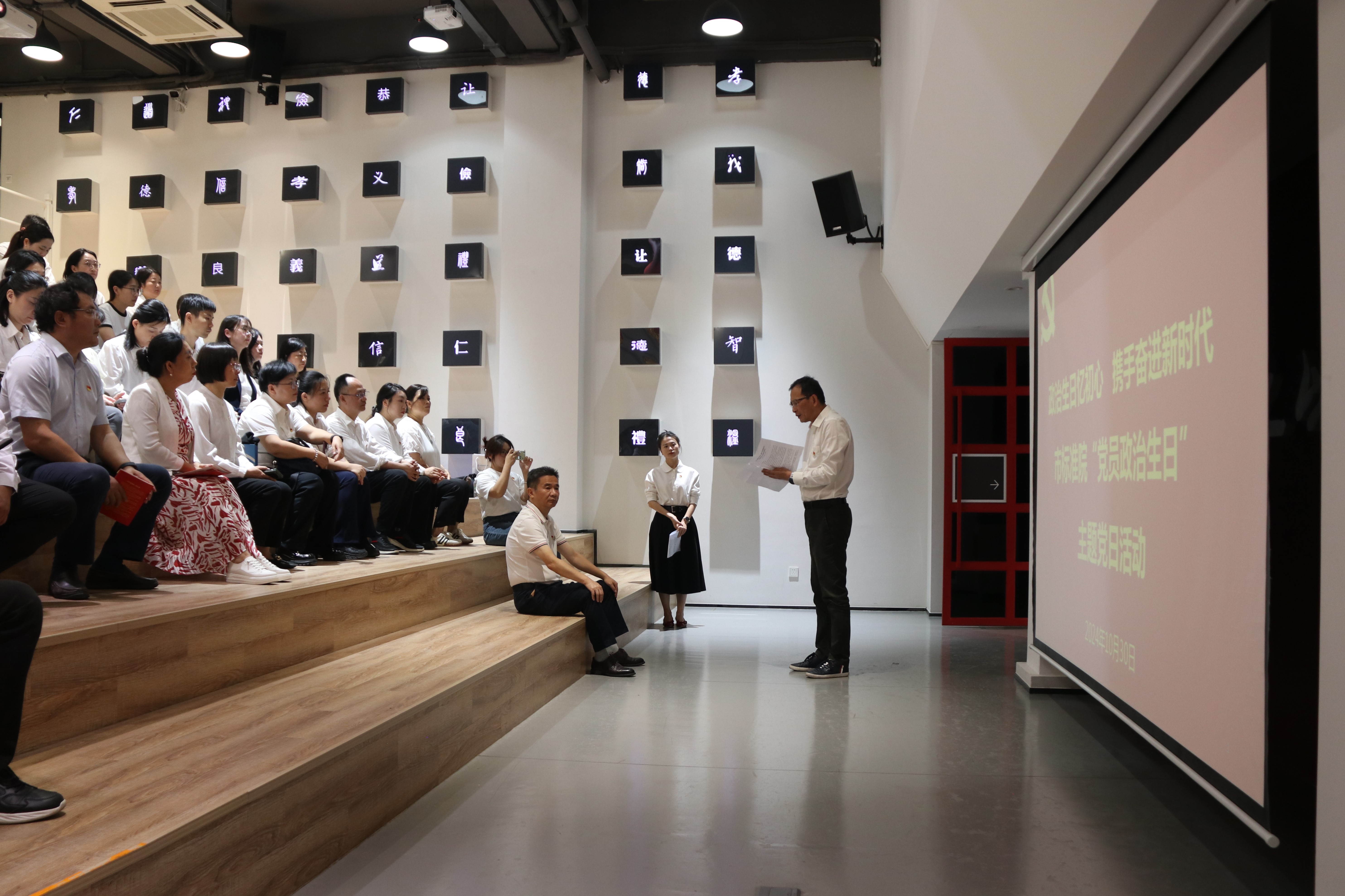 随后在道德讲堂举行了集体“政治生日”仪式,周鹏同志带领全体党员重温入党誓词,并为上半年加入中国共产党的党员庆祝“政治生日”,送上院党委精心准备的“政治生日”贺卡,鼓励他们在党的光辉旗帜下不忘初心、砥砺前行,接着由陈嘉、袁源两位同志作为党员代表分享本次活动心得体会,分别谈了个人对崇廉尚廉、知耻明礼、廉洁自律、坚守底线的感悟,并表明了未来“悟于心,践于行”的决心。